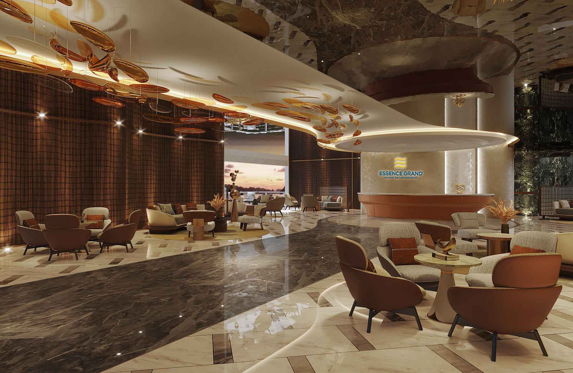 Qúy khách di chuyển tới du thuyền, thưởng thức đồ uống chào mừng tại nhà hàng Cloud Nine và lắng nghe hướng dẫn về lịch trình, các quy định an toàn, sau đó nhận phòng.