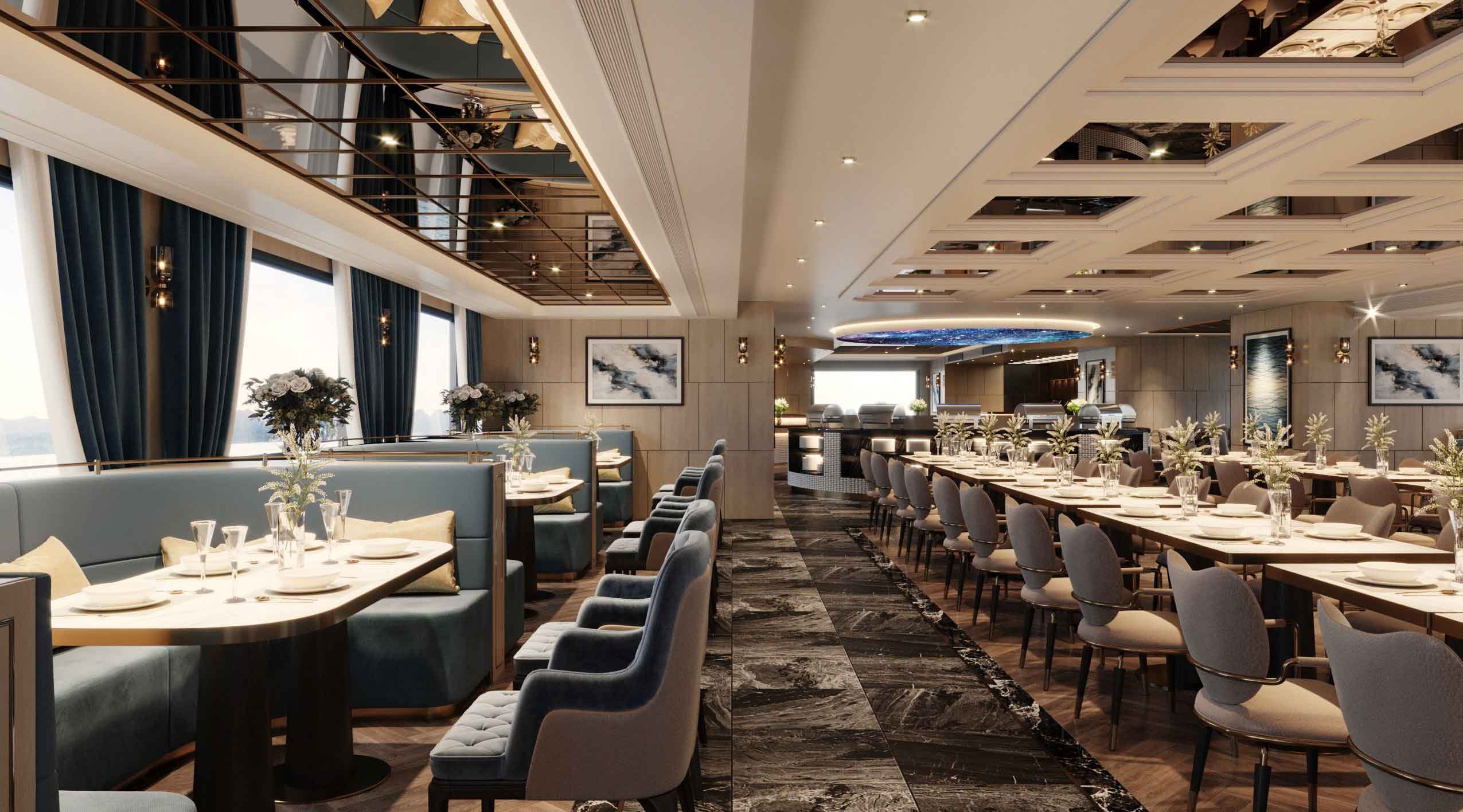 Thưởng thức bữa trưa tại nhà hàng trong khi du thuyền bắt đầu hành trình khám phá Vịnh Hạ Long.