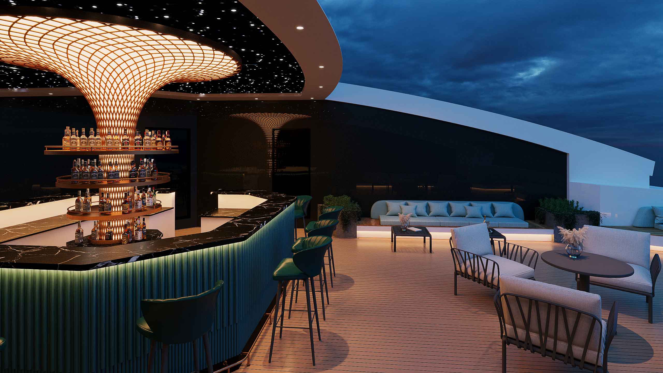 Đón hoàng hôn trên Vịnh Hạ Long, lựa chọn và tận hưởng ưu đãi cho đồ uống ưa thích của bạn tại Lighthouse Sky bar hoặc tham dự lớp học nấu ăn do các đầu bếp trên du thuyền hướng dẫn.