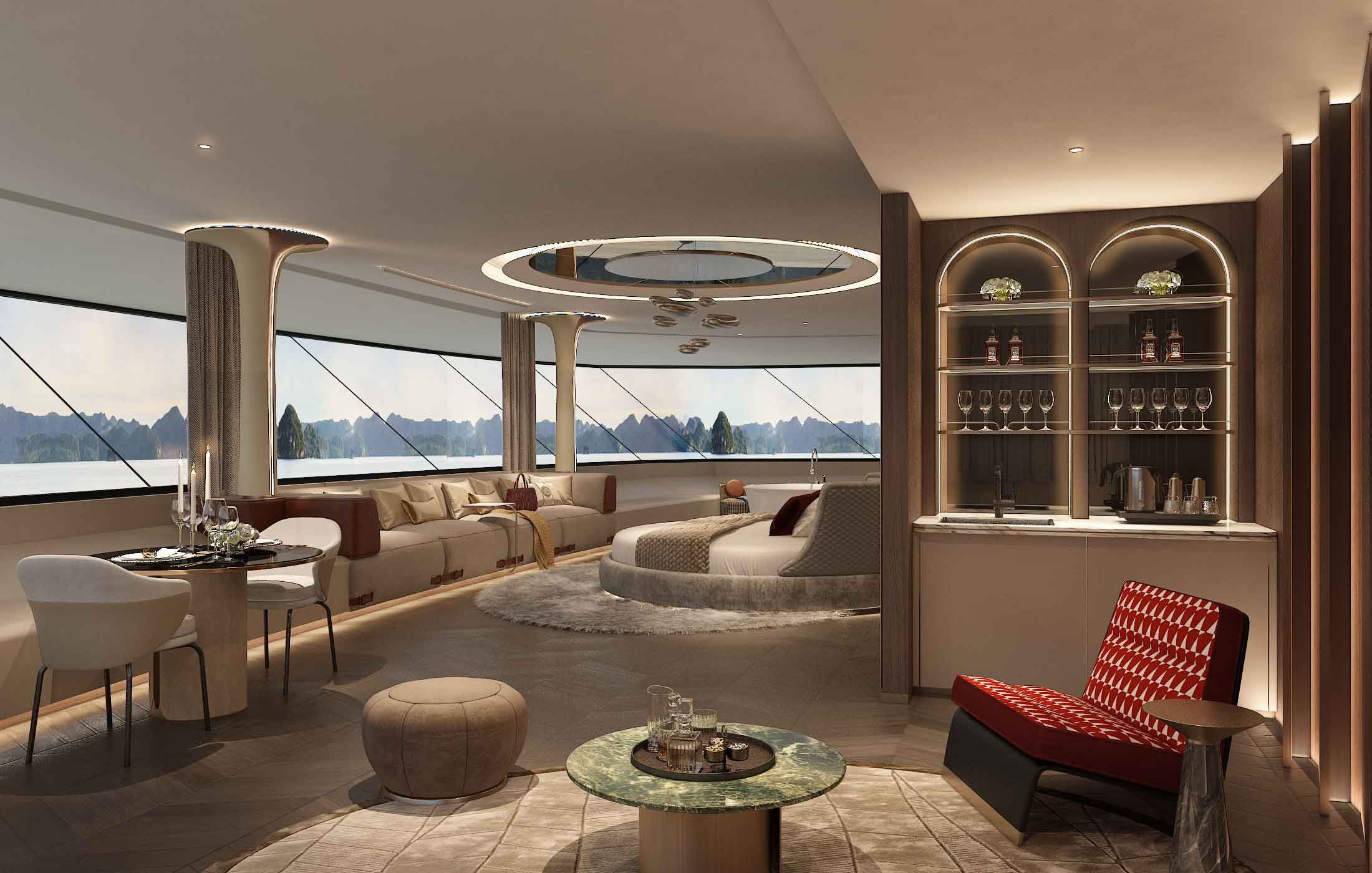 Qúy khách có thể lựa chọn nghỉ ngơi trên Du thuyền, trải nghiệm các dịch vụ spa & massage, các tiện ích tại bể bơi, bar, cigar club, các trò chơi giải trí poker, bi-a, bi-lắc, thư viện và khu vực kid’s club dành riêng cho trẻ em.