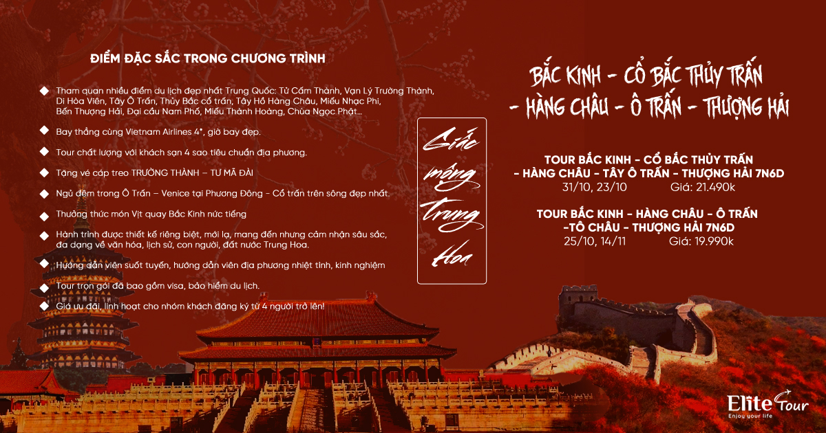 Tour Bắc Kinh - Hàng Châu - Tô Châu - Thượng Hải 7 Ngày 6 Đêm (Bay Vietnam Airline)24,590,000 VND 20,890,000 VND / Khách