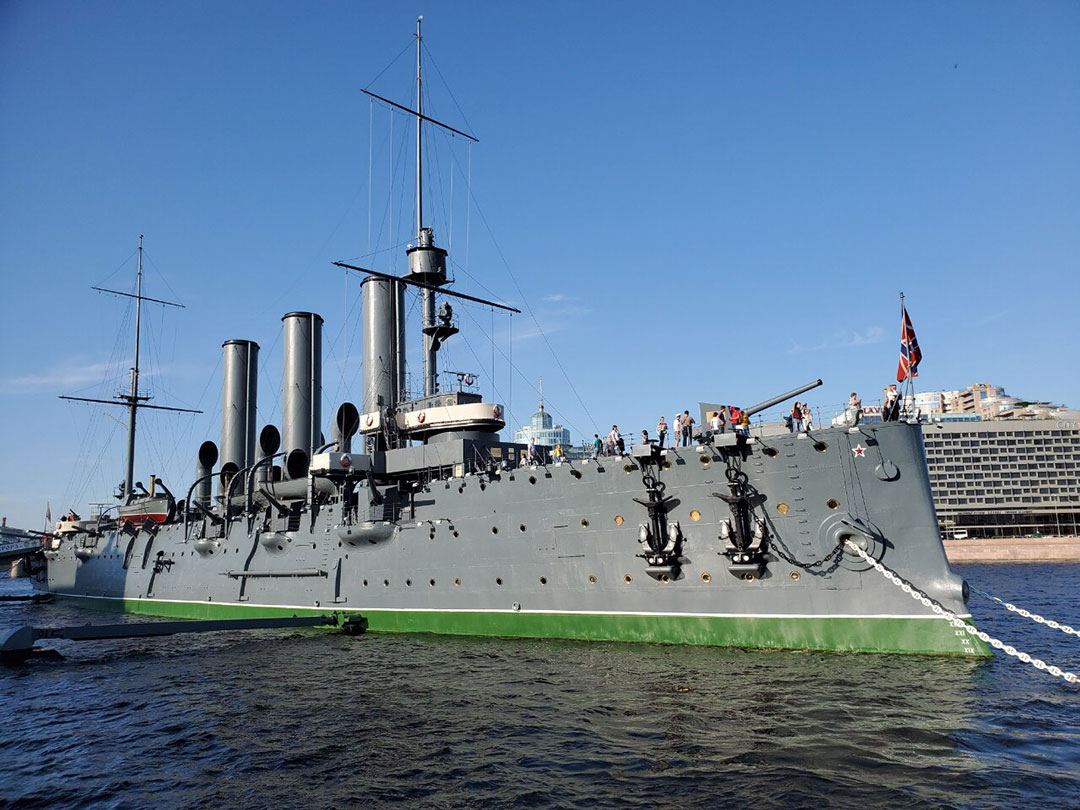 ✔ Chiến hạm Rạng Đông (Aurora) sẽ luôn là một dấu ấn lịch sử không thể quên đối với người Nga. 9 giờ 45 phút tối ngày 7/11/1917, chiến hạm đã nã phát pháo đầu tiên vào Cung điện mùa đông, khởi đầu cho Cách mạng tháng Mười Nga vĩ đại. Aurora được đóng tại Saint Petersburg và hạ thủy vào năm 1900 trên dòng sông Neva. Trong chiến tranh Nga – Nhật, nó được sử dụng như một lá chắn cho các con tàu tốc độ chậm của Hải quân Nga.