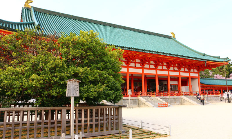 + Đền Heian-jingu là một công trình kiến trúc tượng trưng cho vẻ đẹp giản dị và tĩnh tại, được xây dựng năm 1895 để kỷ niệm 1100 năm ngày Nhật hoàng Kammu dời kinh đô đến Heian-kyo tức là thành phố Kyoto ngày nay. Tên gọi Heian nói về một thời kỳ, một triều đại ở giai đoạn đỉnh cao của quyền lực Nhật Hoàng trong lịch sử Nhật Bản (từ năm 794 đến năm 1185), đánh dấu sự phát triển của nghệ thuật, thơ ca và văn học.
